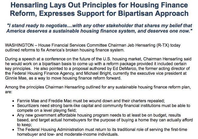While retaining its meaning, I would phrase this last point somewhat differently: “We need to hamstring Fannie and Freddie so that the big banks can make even more money off consumers than they’re making now.”